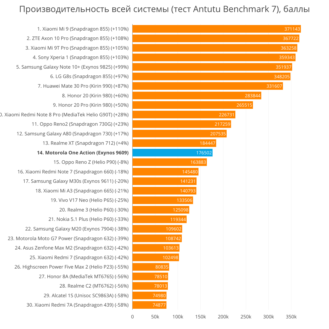 Но это в сумме – присмотритесь к графику внимательнее. Например, Redmi Note 7 отстал в значительной степени из-за дикой прожорливости в режиме игр (а их будут устанавливать далеко не все покупатели One Action), а в целом-то Моторола сверхвыносливая разве что в просмотре фильмов. Потому что этот просмотр для процессора даже менее энергозатратен, чем автоперелистывание страниц большущей (мы тестируем смартфоны на 12 Мбайт .fb2) книги. Но даже это для смартфона с IPS-дисплеем и средним объёмом аккумуляторе уже очень крутой показатель.