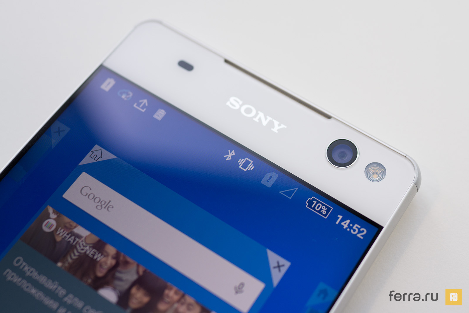 Еще один важный момент – возможность записи 4K-видео. Она впервые появляется у Sony в средней ценовой категории. Фронтальная камера выделяется своими размерами – крупный объектив сразу же говорит о большой диафрагме и наличии автофокуса. Фокусировка в самом деле имеется, а диафрагма соответствует значению F2.0. Это нужно для более качественной съемки селфи при слабом освещении. Вспышки на лицевой стороне не предусмотрено, зато угол у объектива селфи-камеры чуть шире, чем у основной.