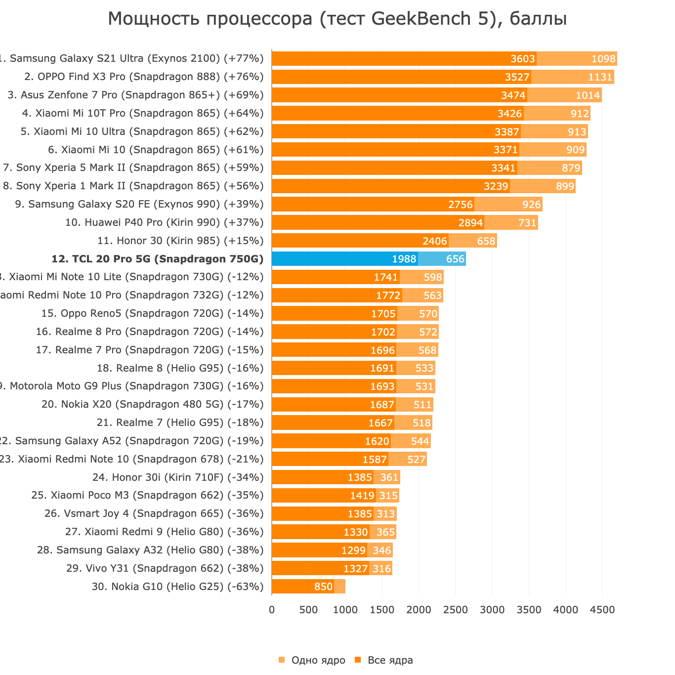 TCL 20 Pro 5G работает на процессоре Qualcomm Snapdragon 750G и имеет 6 Гбайт оперативной памяти. Как видно по тестам, этот процессор (точнее — система на чипе) чуть мощнее 730G и 720G, которые до сих пор используют конкуренты. При этом производительность GPU здесь на уровне MediaTek Helio G95 (если что, это хорошо — G95 у медиатека вообще отличным получился).