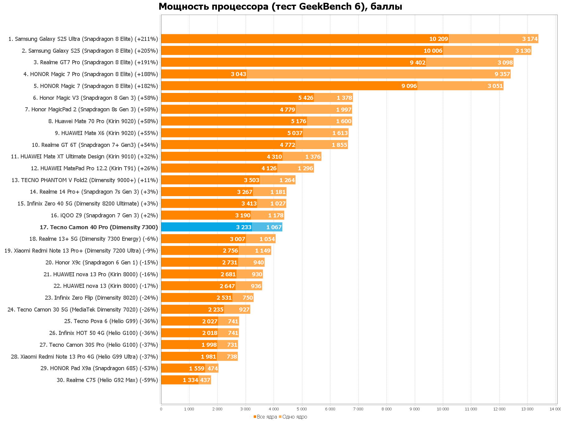 TECNO CAMON 40 Pro 5G оснащён восьмиядерным (4 ядра Cortex-A78 2.5 ГГц для мощности и 4 ядра Cortex-A55 до 2 ГГц для энергоэффективности) чипом MediaTek Dimensity 7300, построенном на техпроцессе 4 нм. Его с головой хватает для многозадачности, функций ИИ, базовых приложений вроде браузеров или мессенджеров, запуска всяких сложных программ. Графика Mali-G615 MC2 тянет большинство игр.