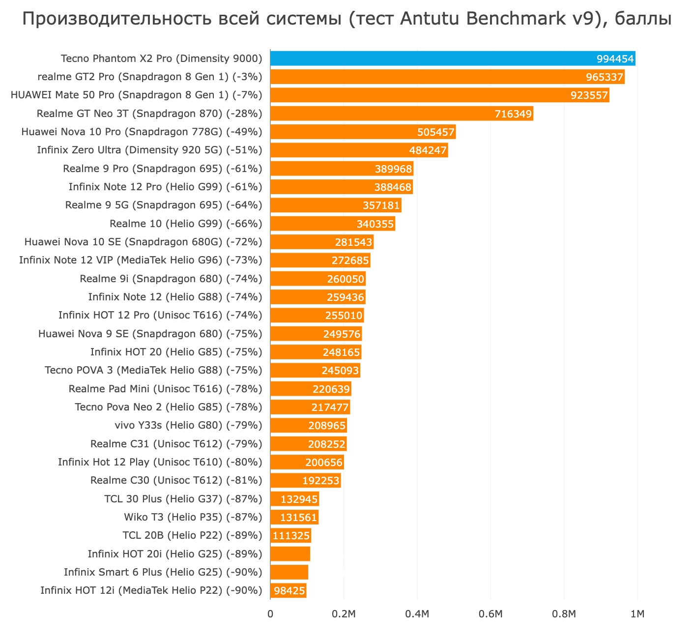 Здесь же прямой конкурент — Qualcomm Snapdragon 8 Gen 1, который сейчас ставят в самые быстрые смартфоны на планете. И знаете, что самое смешное? Медиатек его уделывает!