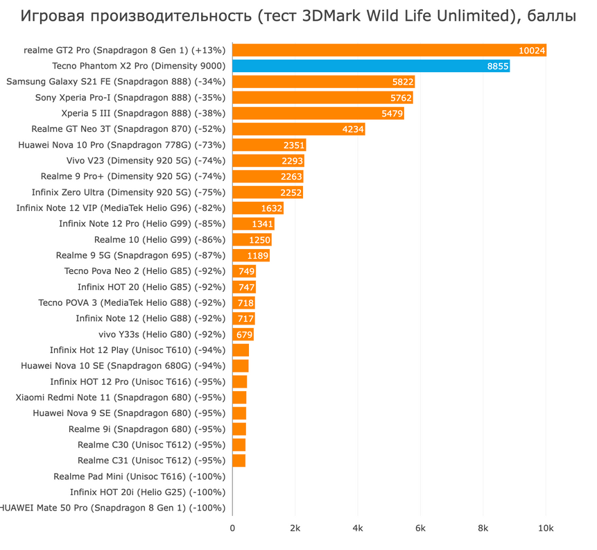 По крайней мере, по CPU. По GPU там уже преимущество на стороне Qualcomm. Но главное, что при всей этой мощи, Techo Phantom X2 Pro почти не тротлит. Так что это не случай “сила есть — ума не надо”, а ровно обратная ситуация.