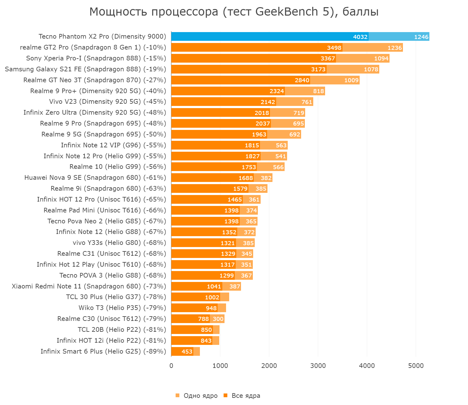 Нам ни разу в руки не попадался смартфон на топовом MediaTek Dimensity 9000. Вот сейчас попался и я под впечатлением: да, медиатековцы уже давно отошли от выпуска yблюдoчногo гoвнa наподобие Helio X10 и MT6589 к более цивилизованным процессорам. И да, я читал, что «Snapdragon уже не тот», а Dimensity 9000 — новый эталон в дорогих смартфонах. Но всё равно — вы только взгляните, как он «порвал» всех по CPU! Фактически он ближе уже к Snapdragon 8 Gen2, чем даже к 8+ Gen1 (разогнанной версии Gen1 на техпроцессе TSMC взамен Samsung). Но да, по графике он на четверть медленнее Снапа, поэтому не рассчитывайте, что 120 кадров в секунду у вас будут прям во всех играх. Но это ладно, это логично.