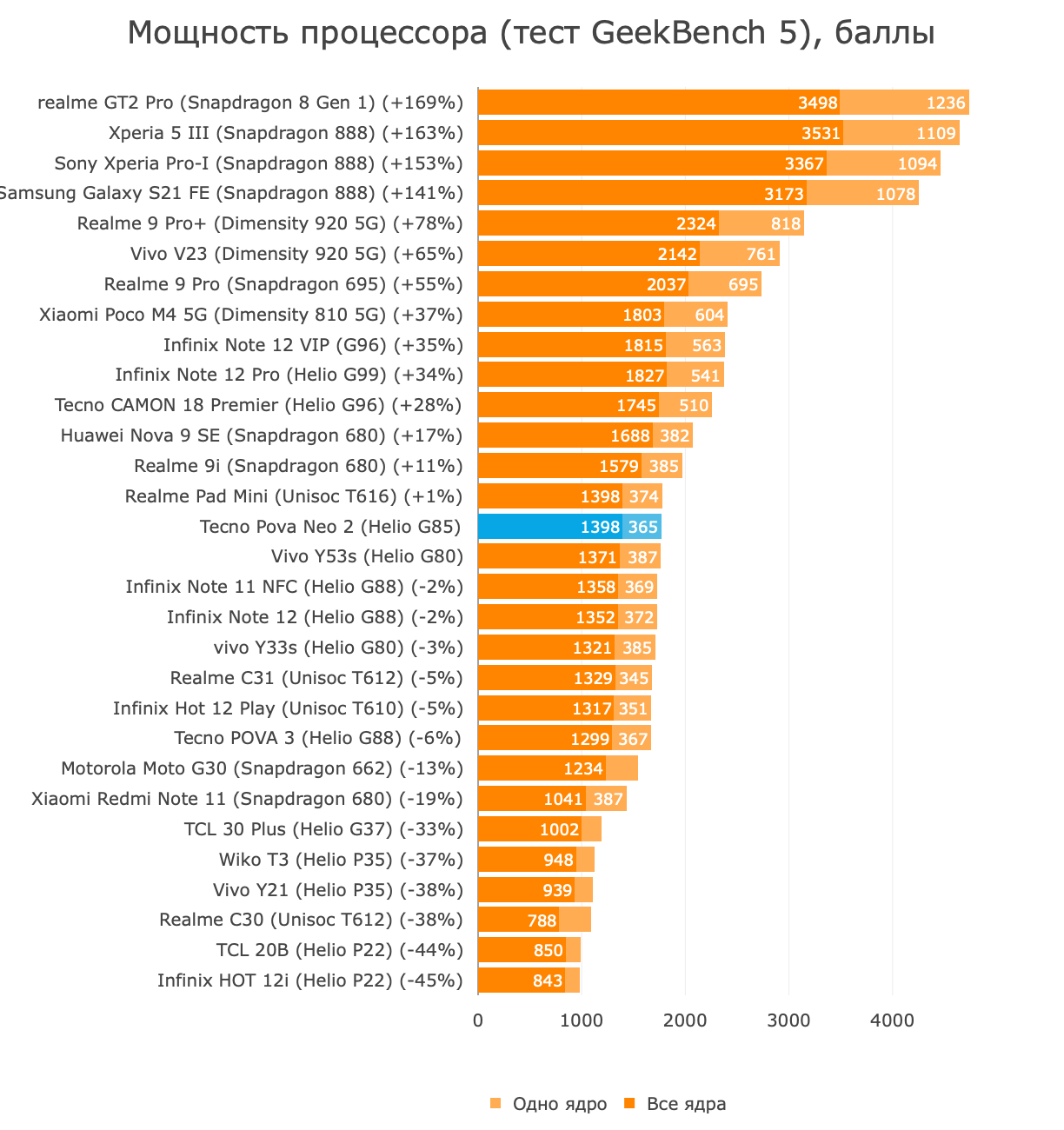 Процессор в POVA Neo 2 — нормальный. MediaTek Helio G85 не назвать полноценным «камнем» среднего класса, но, как видите, новомодные Unisoc T600 серии, типичные для смартфонов за 12-18 тысяч рублей, не быстрее (и у них иногда бывают проблемы с GPS). А лучшие процессоры в смартфонах за 15-18 тысяч — это тот же Snapdragon 680, который да, быстрее на 17%, но взамен у вас в смартфоне будут стандартные 5000 мАч вместо 7000 мАч без особых плюсов взамен.