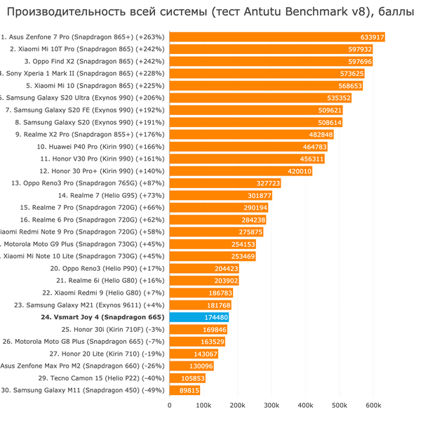 А вот с автономностью сюприз всё-таки получился, но, к сожалению, неприятный. Со своими 5000 мАч бюджетный Vsmart Joy 4 на нашем графике соседствует с топ-моделями типа Samsung Galaxy S20 и Oppo Find X2, у которых ещё и 4000 мАч (правда, более экономичный дисплей AMOLED), и с ZenFone 7 Pro от ASUS, который экономичностью не славится, но тоже с AMOLED.