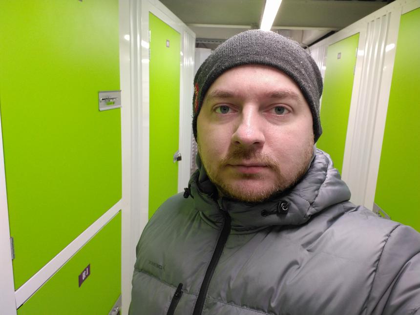 Сверхширокоугольная камера, что интересно, делает картинку светлее и более адекватно по освещению, но “рисует” совсем другие цвета. Обратите внимание на фотографии, где я на складе — и на селфи-камере, и на основной двери одного цвета, а на сверхширике — другого.