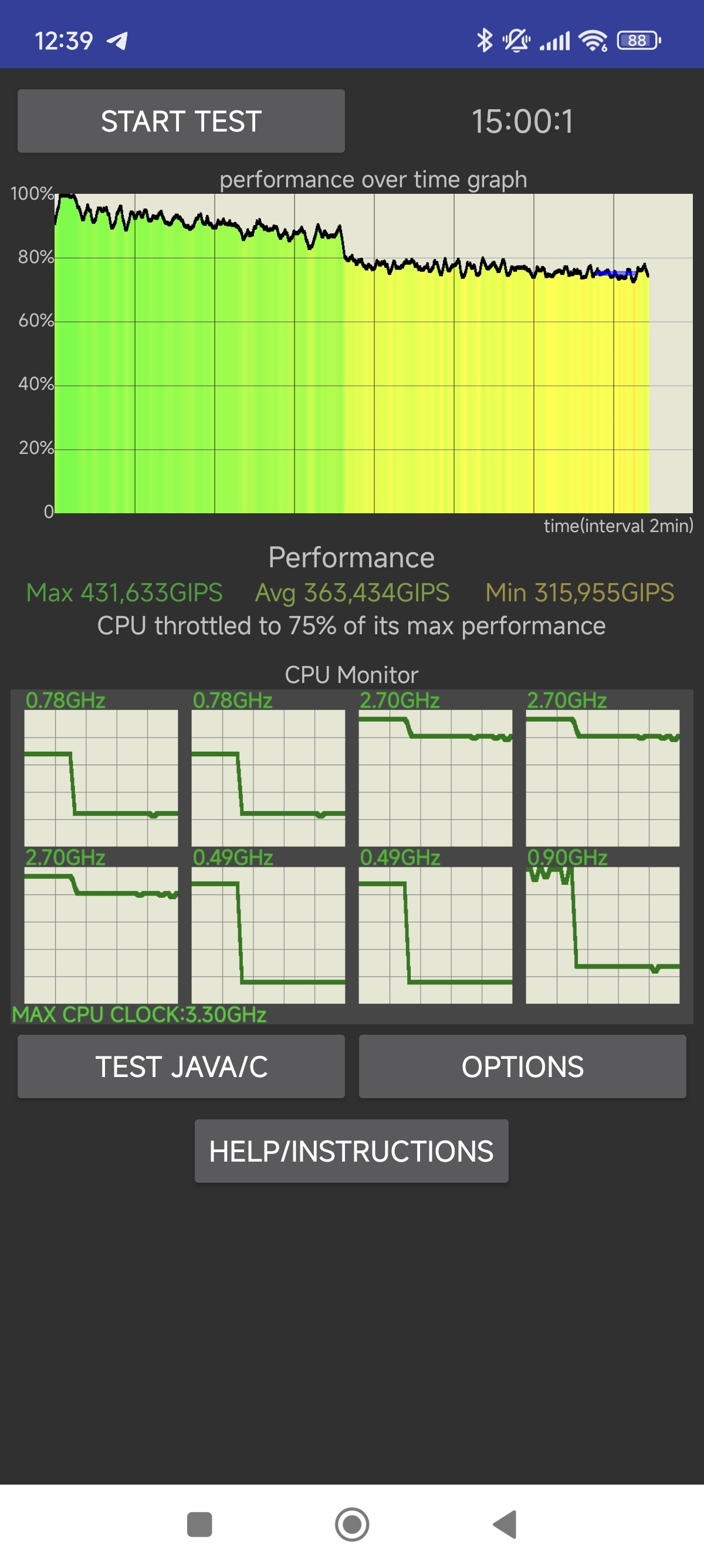 Что касается тротлинга, то всё не так уж и плохо, как я ожидал (обычно флагманские процессоры страдают от сильного тротлинга). Я провёл несколько тестов и худшим результатом было снижение производительности до 73% от изначальной. Даже у смартфонов с гораздо более крупным корпусом перегрев бывает более существенным.