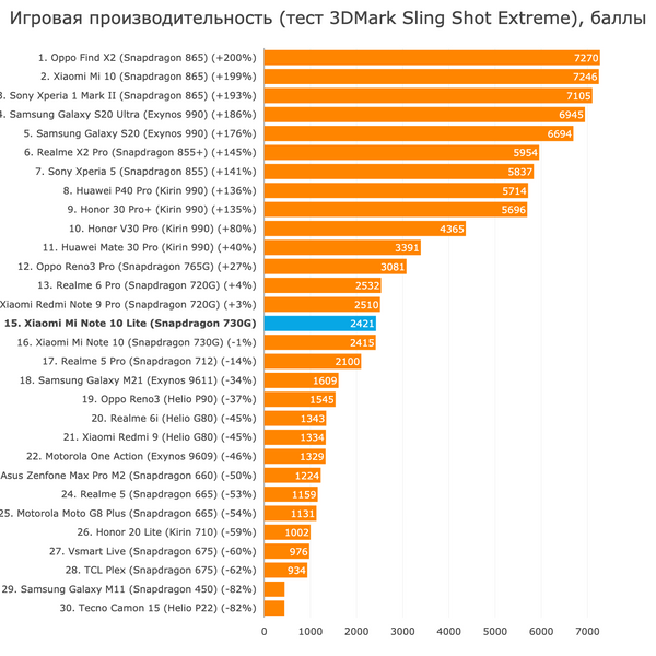 Сердце Mi Note 10 Lite — Qualcomm Snapdragon 730G. Это современный экономичный и довольно быстрый процессор для смартфонов среднего уровня. Относительно обычного Snapdragon 730 здесь чуть разогнана графика для улучшенной работы игр. Но это только в теории производительность вырастает на 15 процентов. В проведенных нами синтетических тестах, разницы со Snapdragon 730 почти нет. Тот же Samsung Galaxy A80 на базе этого чипа выдает похожие значения в бенчмарке, которым издавна принято измерять игровую производительность — 3DMark.