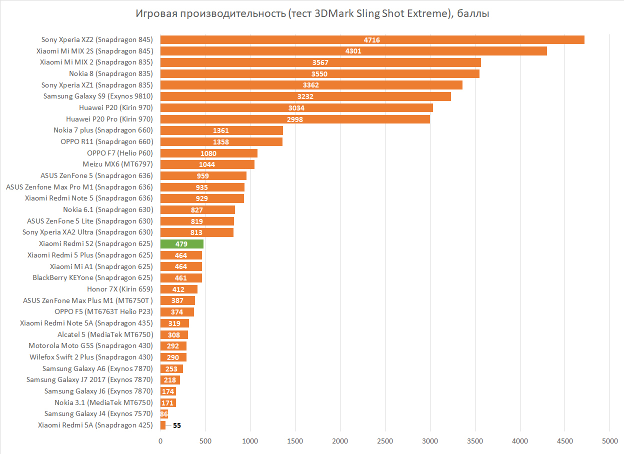 Новинка комплектуется не самым свежим процессором — 8-ядерным Qualcomm Snapdragon 625. Таким же, как и прошлогодний Xiaomi Mi A1. Плохо? Не совсем. Скорость работы по-прежнему хорошая, если сравнивать Redmi S2 со смартфонами других марок в категории 13 000 рублей. И нет особого повода брезговать, потому что по производительности Redmi S2 играючи опережает такие модели, как Nokia 3.1, Alcatel 5, Samsung Galaxy A6 и другие за сравнимые деньги. С 625-м еще пока рано волноваться, что смартфон станет слишком «тупым» в ближайшие год-два. Конечно, по потенциалу в играх он с флагманскими процессорами (или даже новеньким Snapdragon 636, как в Redmi Note 5) не сравнится, но в повседневных приложениях работает расторопно.