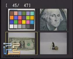 Также с чувствительностью от 80 до 1600 единиц была сфотографирована тестовая таблица Munsell ColorChecker. На снимке, приведённом ниже, зелёными квадратами обозначены области кроп-фрагментов.