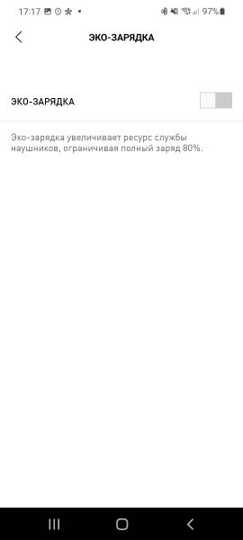 Ещё можно включить в настройках приложения эко-зарядку, что должно продлить срок службы наушников, но сократит автономность, т.к. аккумуляторы будут заряжаться только на 80%. Впрочем, это, на мой взгляд лишнее — быстрее такие наушники выйдут из моды и вы их чем-то замените.