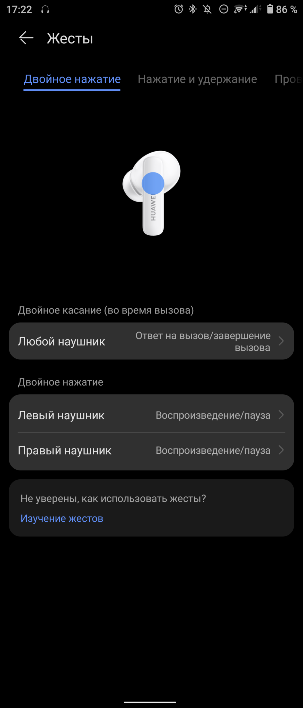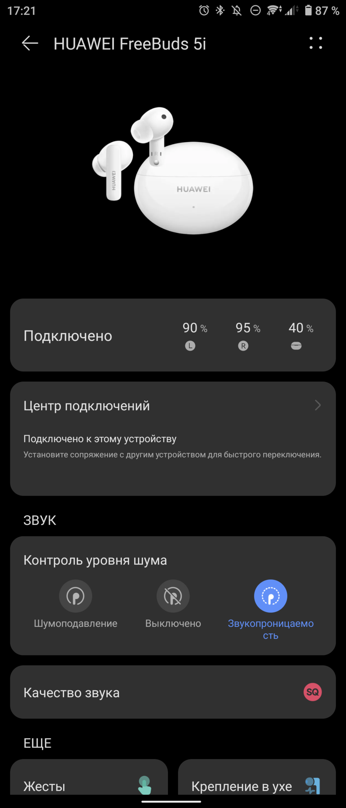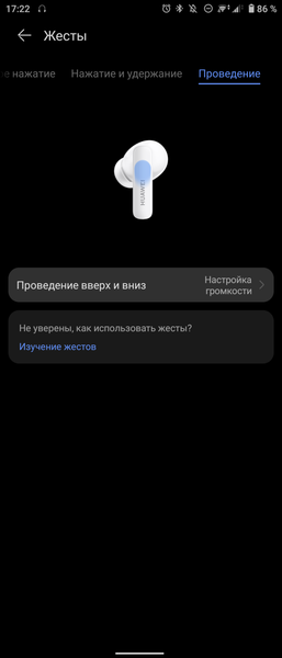 Несмотря на довольно короткую ножку, наушники управляются жестами. Смахиваниями можно управлять громкостью, либо же переключать треки. Обычные касания пригодятся для включения режима шумоподавления и перехода к режиму «прозрачности», когда микрофоны наушников транслируют внешний звук вам в уши. Случайных или некорректных срабатываний я за время тестирования не наблюдал.