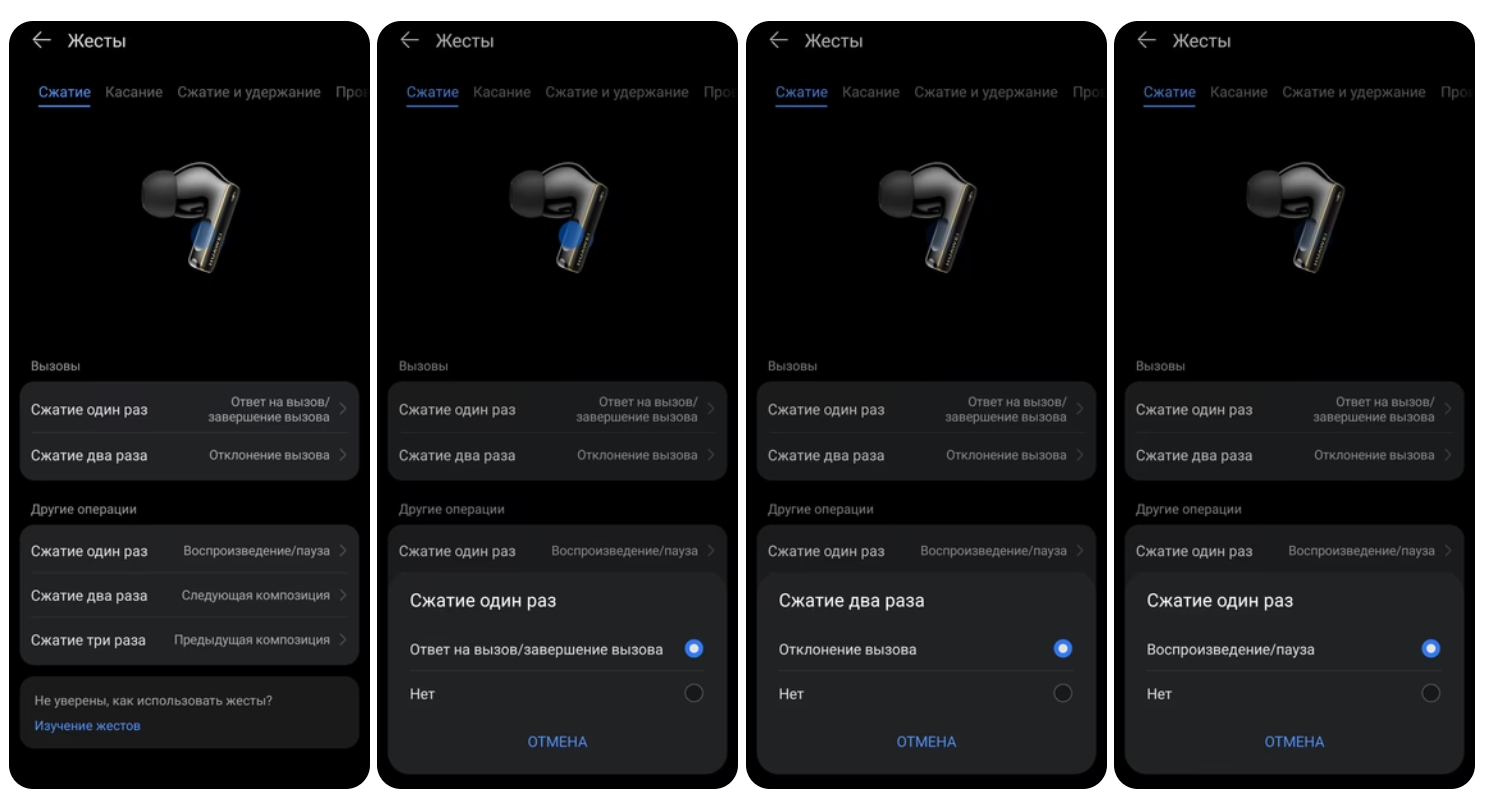 В Huawei всё по-божески. Не, вы тоже можете проведением вниз по боковине наушника громкость добавлять или убавлять. А можете и отключить эту функцию, чтобы не срабатывала, когда вы поправляете наушник в ухе. А сжатие здесь — это если хотите на него навесить ответ на звонок или «положить трубку», но проще на постукиваниях всё это делать, потому что удобнее.