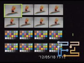 Для оценки шумности использовался следующий метод: фотографировалась группа разноцветных объектов со всеми значениями чувствительности в формате JPEG с наименьшим сжатием. Кроп-фрагменты создавались в Adobe Photoshop CS5 с последующим сохранением в формате JPEG с минимальным коэффициентом сжатия. На снимке, приведенном ниже, зеленым квадратом обозначена область кроп-фрагмента. Исходные полноразмерные снимки можно скачать по ссылке.