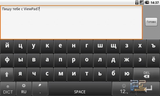 Вот что мне в интерфейсе понравилось — так это клавиатура в ландшафтном режиме (этот режим для планшетов является стандартным). Конечно, не совсем удобно, что при печати текста на экране не остаётся ничего кроме собственно клавиатуры и поля ввода, но зато клавиши действительно большие, а за счёт относительно малых габаритов планшета можно печатать двумя большими пальцами, обхватив устройство руками — во всяком случае, у людей с длинными пальцами это точно получится. Раскладка клавиатуры переключается нажатием одной кнопки, и это действительно удобнее, чем «листать» клавишей «пробел», как сделано во многих планшетах на Android 2.2.
