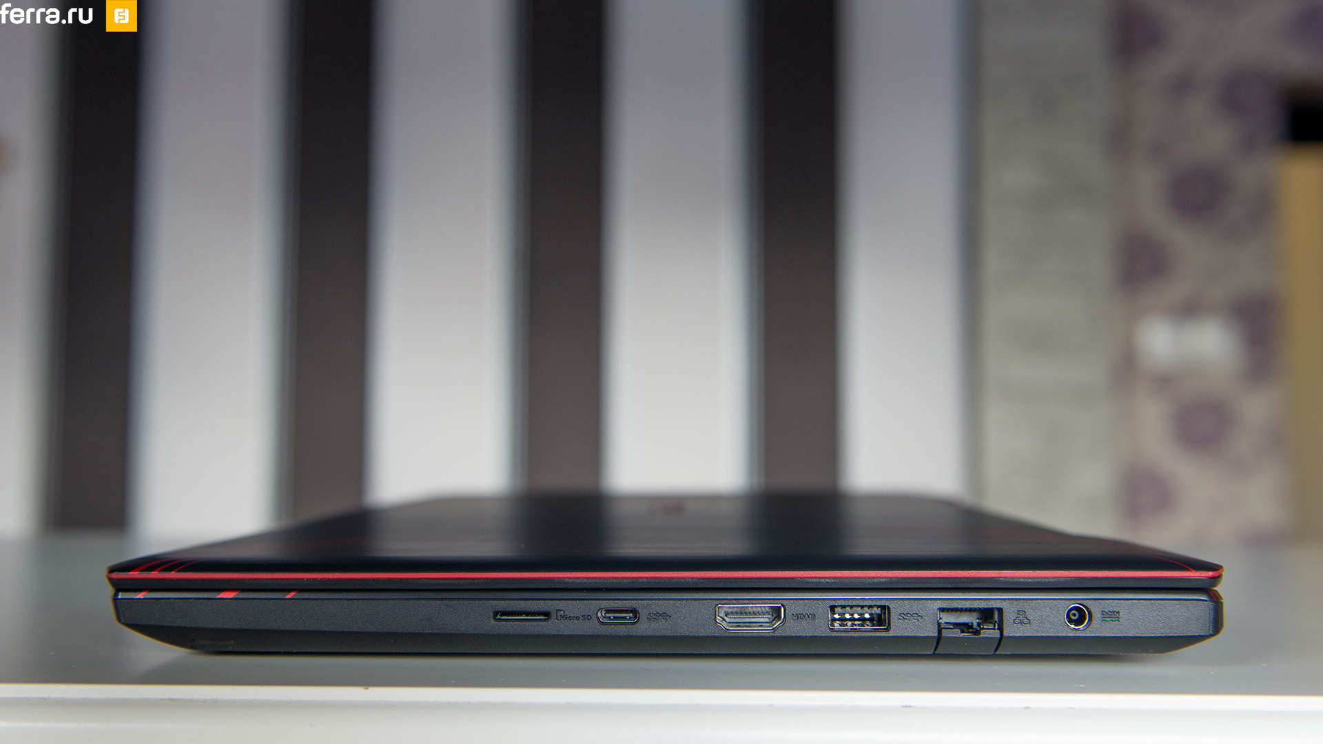 Порты у ASUS FX570 — разнообразные. Даже зачем-то есть целых два порта USB раритетной второй версии. Также имеется один USB 3.0 c привычным разъёмом Type-A и еще один Type-C. Видеовыходом служит HDMI, но версии 1.4, которая не поддерживает 4К c частотой обновления 60 Гц. Присутствует и разъём для подключения к сети по кабелю, то есть RJ-45, а также один мини-джек для гарнитуры и слот для microSD (лучше бы был SD).