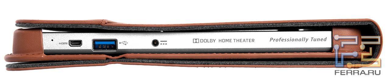 Слева находятся микрофон, microHDMI и портUSB 3.0 для подключения периферии и внешних накопителей, разъем питания, а заодно еще и пару солидных надписей «Dolby Home Theater» и «Professionally Tuned».