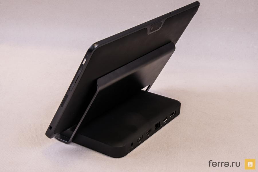 Док-станция тоже умеет подпитывать планшет, но уже от розетки — у этого аксессуара сугубо «настольное» предназначение. С её помощью возможности Venue расширяются до уровня крупного ноутбука: количество USB разъёмов возрастает до четырёх (3 в док-станции + 1 в планшете), для подключения монитора становятся доступны полноразмерные выходы DisplayPort и HDMI, а передача данных становится возможной и по проводам.
