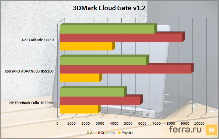 Взгляните, насколько сильнее конкурентов оказался Latitude в просчёте физики – именно она просчитывается на мощностях процессора. В DirectX 11 (тест Fire Strike) наш ноутбук умудрился «подпрыгнуть» на 260% относительно конкурентов. В DirectX 10 (Cloud Gate) прирост составил 32% соответственно.