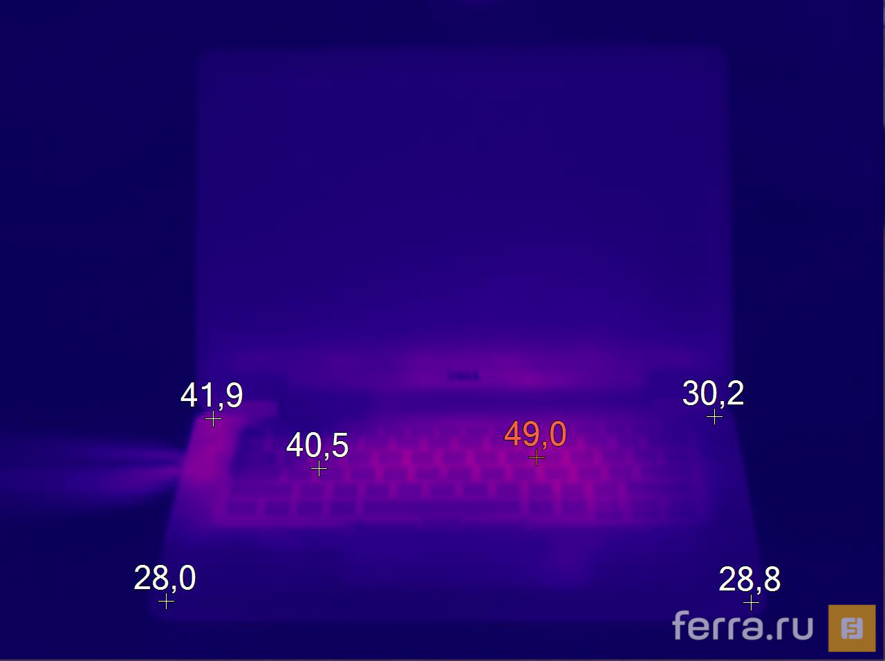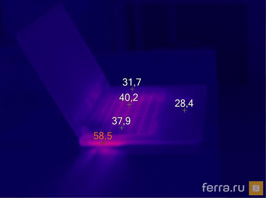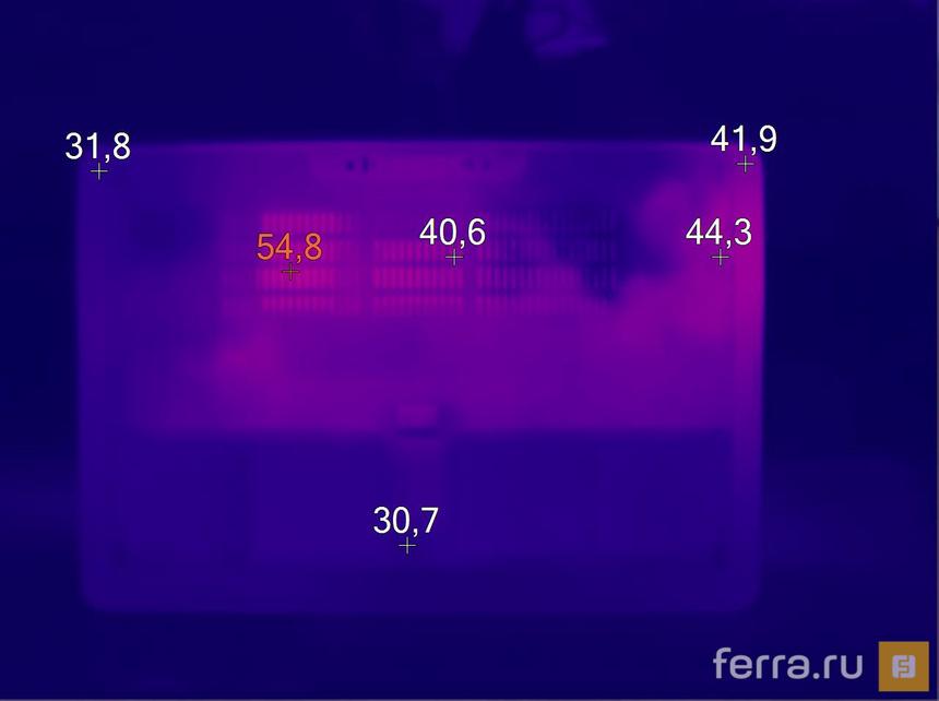 Но гораздо больше нервирует склонность ноутбука равномерно подогревать корпус до тёплого состояния в режиме стресс-теста. Мощное железо, разумеется, требует жертв, но когда 50% площади дна преодолевает отметку 40 градусов по Цельсию, а на противоположной стороне ряд клавиш прогревается до 50 градусов — волей-неволей начинаешь задумываться, стоит ли тишина в умеренной нагрузке таких жертв.