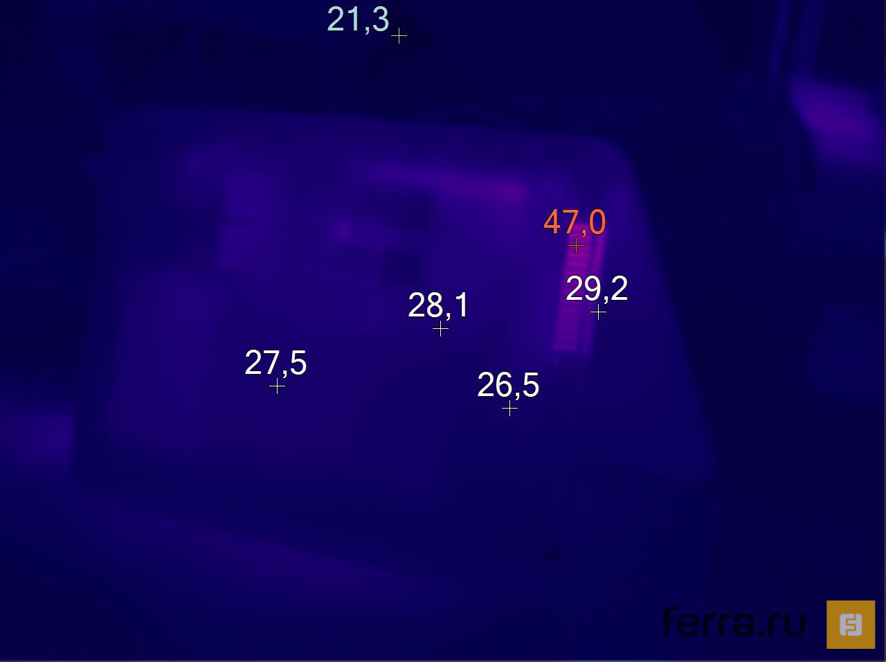 Уровень нагрева в нашем ноутбуке всегда оставался в пределах нормы: даже продолжительные «пытки» играми не сделали металлическую рабочую панель горячей, а дно — даже тёплым. Это и не удивительно — охлаждать низковольтный 15-ваттный чип Intel не составляет труда практически любой системе охлаждения в современных ноутбуках. Процессору в такие моменты иной раз приходится не сладко — его температура достигает 80 градусов по Цельсию, но до критических 100 градусов ещё очень далеко, а потому волноваться не о чем.