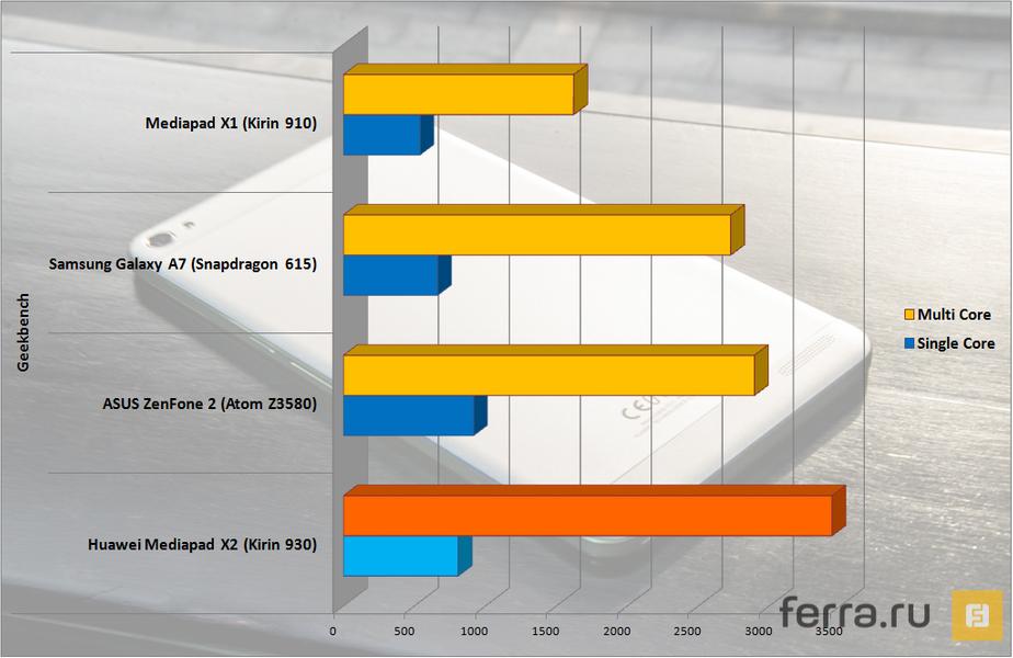 Хорошая новость состоит в том, что в плане производительности процессора MediaPad X2 очень крут — во многопоточном режиме высокая тактовая частота всех восьми ядер позволяет нашему планшету вырвать победу у грозного Intel Atom в Geekbench, а затем и в Antutu. Это лишь красивые цифры, но суть заключается в том, что X2 настолько же быстр и в работе: многозадачность под грузом фирменной оболочки Huawei даётся ему легко, чего нельзя сказать об X1, который начинает притормаживать с первых секунд работы.