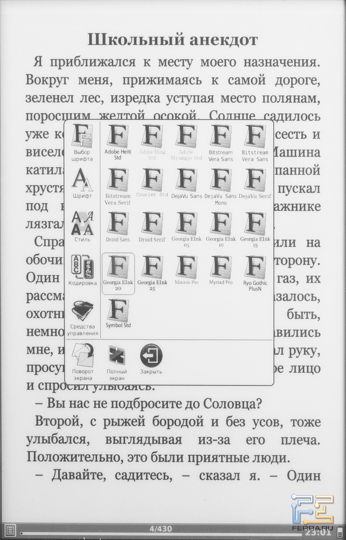 Страницы перелистываются быстро в книгах во всех форматах, причём делать это можно аж тремя способами: кнопками со стрелками слева, джойстиком справа и качелькой на нижнем торце. Кнопка с иконкой дома почему-то вызывает контекстное меню, где можно настроить параметры отображения и установить закладки. Быстрым доступом здесь и не пахнет, до любой функции приходится добираться непростым путём с помощью джойстика.