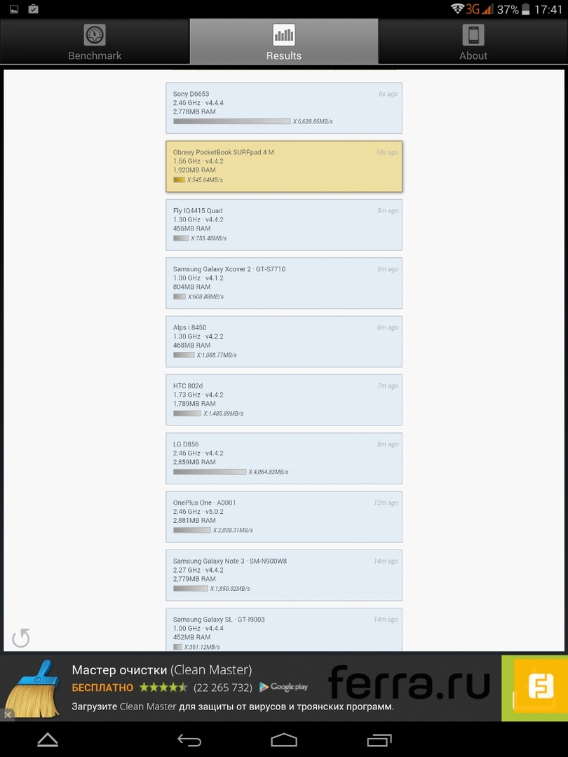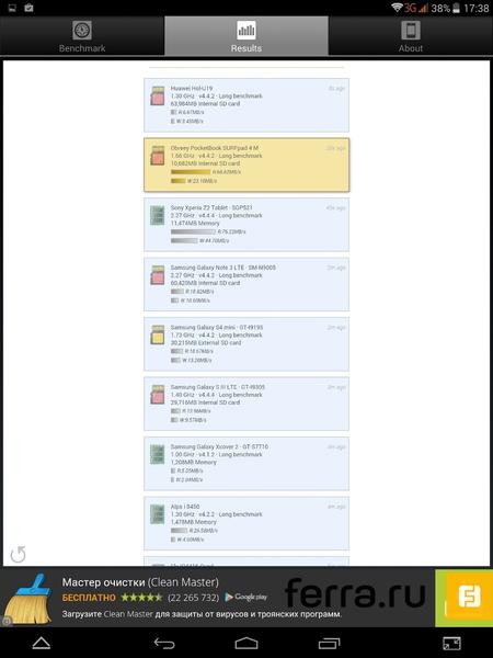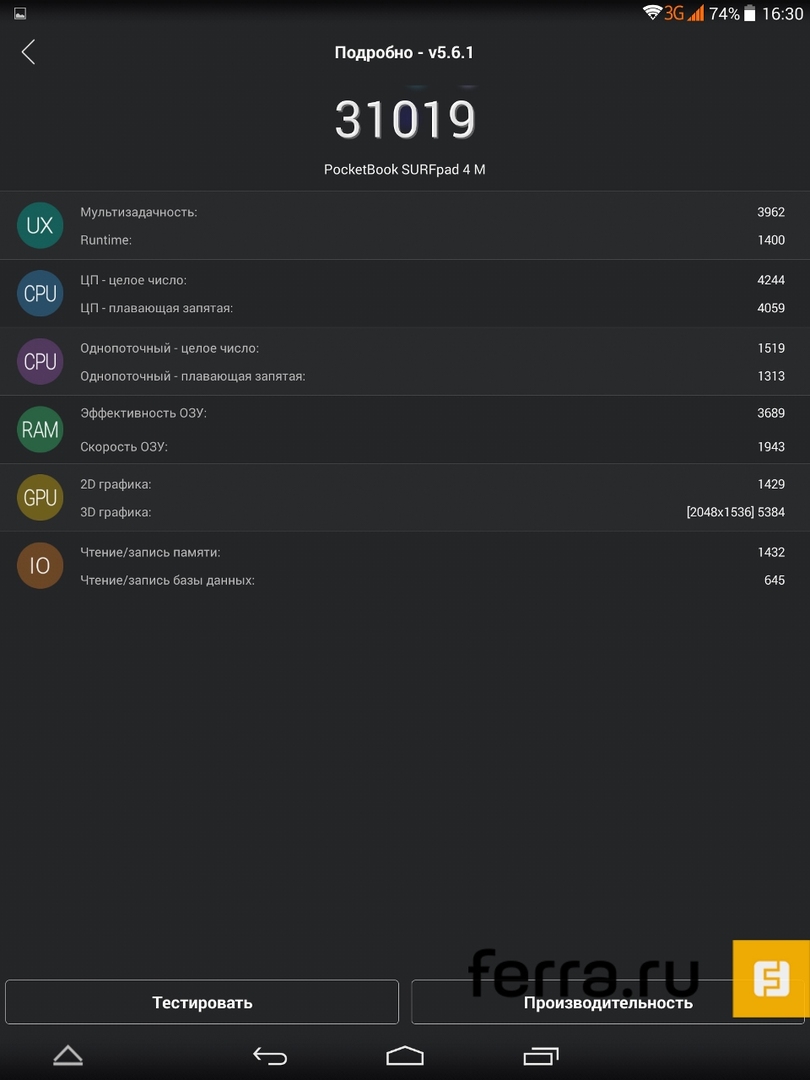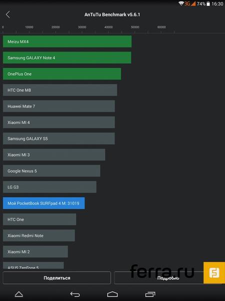 Максимальный уровень яркости дисплея составляет 345,9 кд/м2, что заметно меньше пиковых для iPad Mini 440 кд/м², однако контрастность в соотношении 730:1 в сравнении с планшетом из Купертино, оказывается выше — iPad способен выдать максимум 600:1. Насыщенность чёрного цвета в нашем SURFpad выглядит типично для IPS-дисплеев, тогда как образцовыми в этой дисциплине по-прежнему остаются матрицы Super AMOLED.