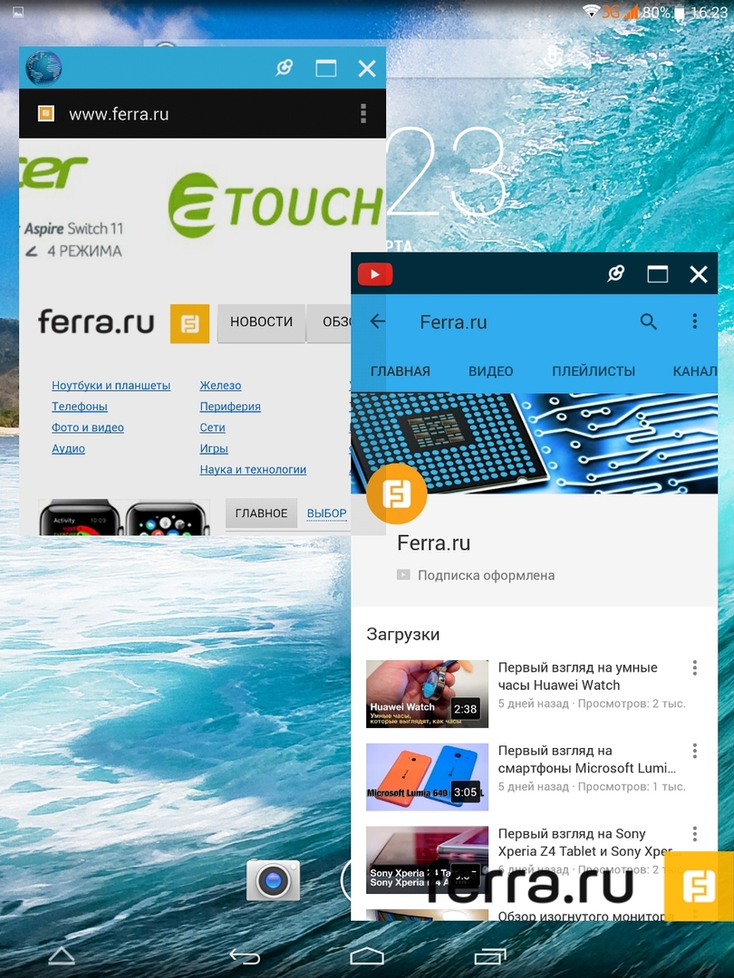 Из немногочисленных нововведений — оконный режим и меню быстрого доступа к приложениям. Нажатием клавиши на системной панели можно отправить практически любое приложение (или несколько) в окно, а затем переключаться между ним и интерфейсом системы. На восьмидюймовом дисплее с «книжным» соотношением сторон такая функция выглядит приятной, и иногда полезной мелочью. Меню быстрого доступа, скорей всего, будет предано забвению большинством пользователей: запускать программы в Android принято иначе, а переучиваться, в большинстве своём, пользователи не намерены.