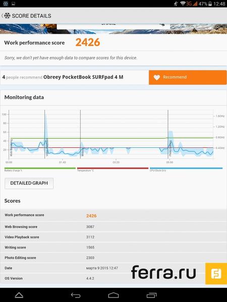 Аккумулятор ёмкостью 4000 мАч для восьмиядерного процессора — не самый лучший выбор. PocketBook SURFpad 4 M разряжается намного быстрее, чем, к примеру, аналогичный по размеру Lenovo TAB S8-50LC, основанный на четырёхъядерном Intel Atom Z3745 при аккумуляторе ёмкостью 4290 мАч.