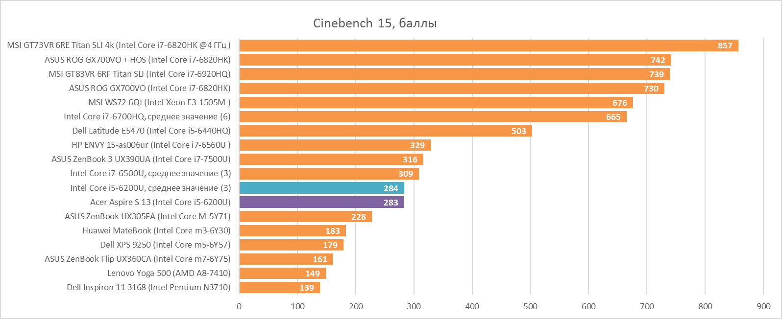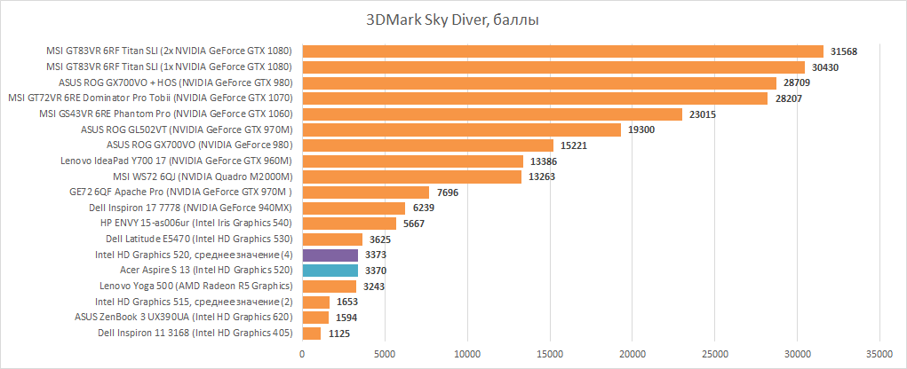 Acer Aspire S 13 оснащается CPU Intel Core i5-6200U — самой распространённой моделью в 2016 году. В ультрабуках бывают и мощнее, но совсем ненамного, иначе бы было невозможно отводить всё тепло, генерируемое процессором. Нам уже попадалось несколько ноутбуков с этим чипом, поэтому мы объединили их результат в один усреднённый, и i5-6200U выдаёт в процессорных бенчмарках не хуже и не лучше этого среднего результата, а значит с системой охлаждения всё также не хуже, чем у остальных. Также в продаже можно найти Acer Aspire S 13 с процессором слабее (i3-6100U) и мощнее (i7-6500U), но разница между ними достаточна условна. Другими словами, если у вам совершенно не хватает производительности i3-6100U, то i7-6500U не станет вашим спасителем.