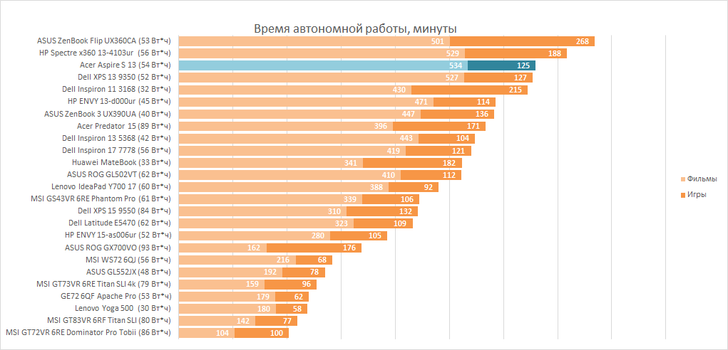 Одно из заметных достоинств Acer Aspire S 13 — долгое время работы от аккумулятора. Правда, какой-то особо энергосберегающей магии в этом нет, просто у ультрабука достаточно ёмкая батарея. Благодаря этому он оказался третьим по времени автономной работы в нашей небольшом сводном чарте. А именно в фильмах Aspire S 13 продержался дольше вообще всех — без шести минут девять часов.