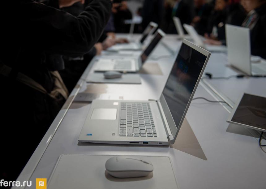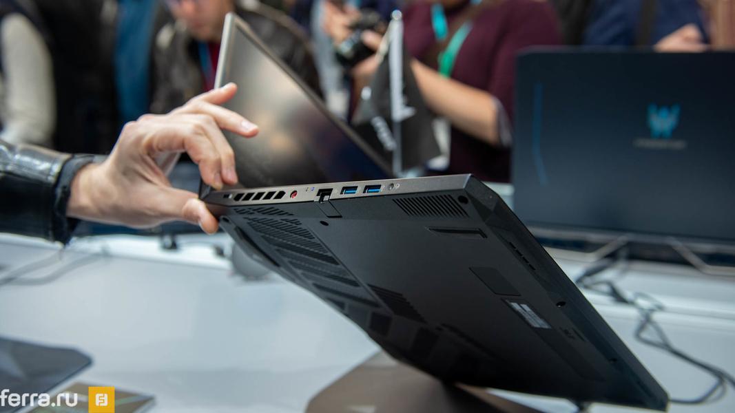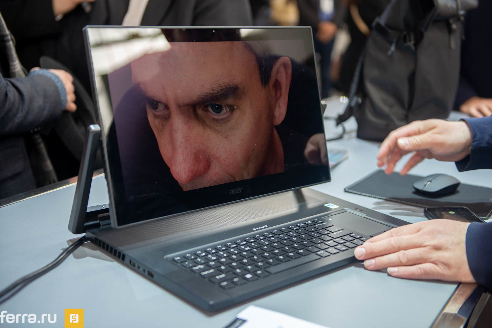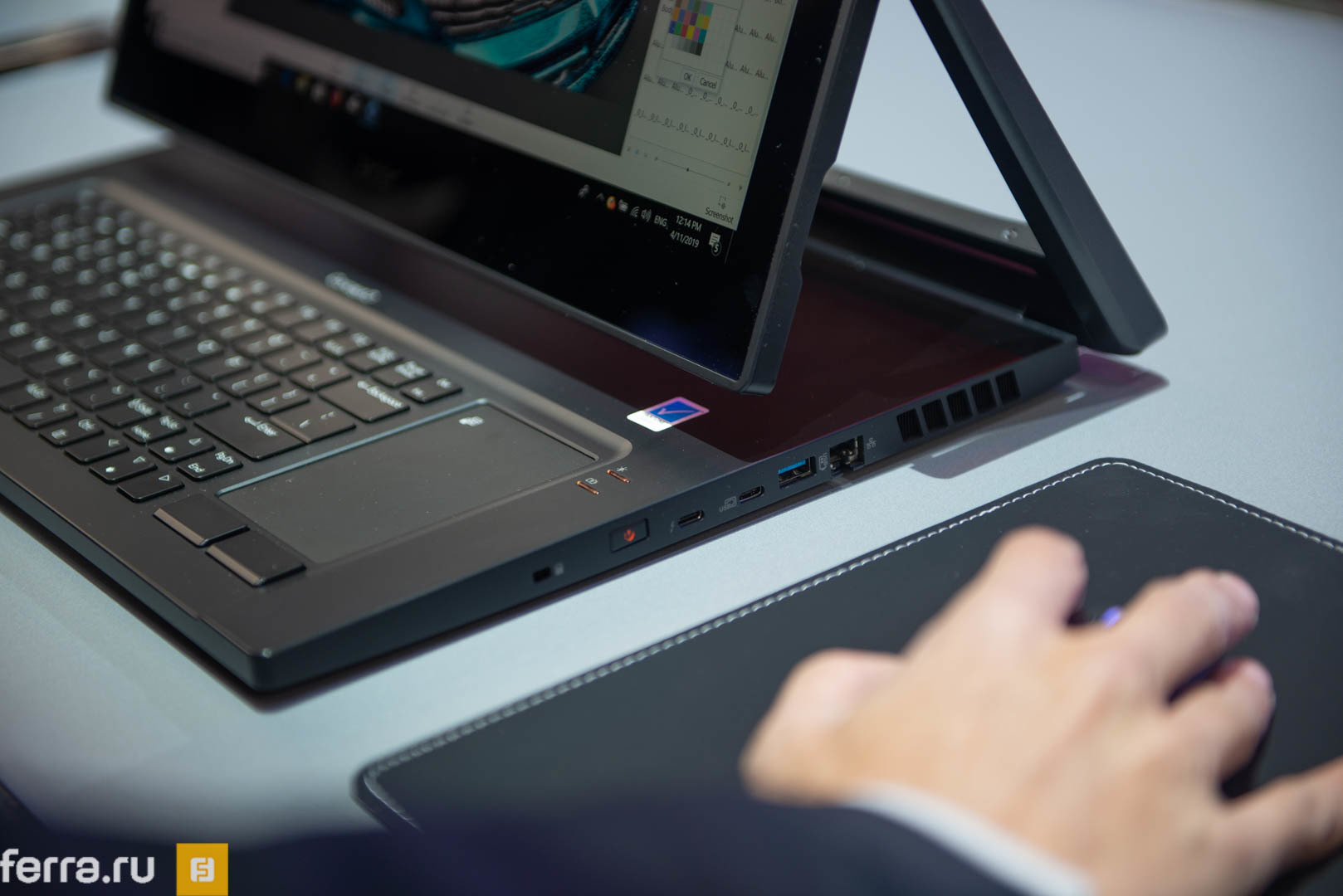 ConceptD 7 тоже с 15,6-дюймовым дисплеем, но уже покрупнее и потяжелее, так как начинка там намного более серьёзная. Правда, он все ещё вписывается в 2,1 кг, так что вполне может жить у вас в рюкзаке. В принципе, все различия укладываются в платформу. Например, здесь уже даже не 6-ти, а 8-ядерные процессоры — самого свежего, девятого поколения. А также обещается видеокарта NVIDIA GeForce RTX 2080 Max-Q — почти самая топовая на данный момент у NVIDIA. И всё это в ноутбуке толщиной всего 18 мм. Ценник, соответственно, повыше — от 150 000 рублей.