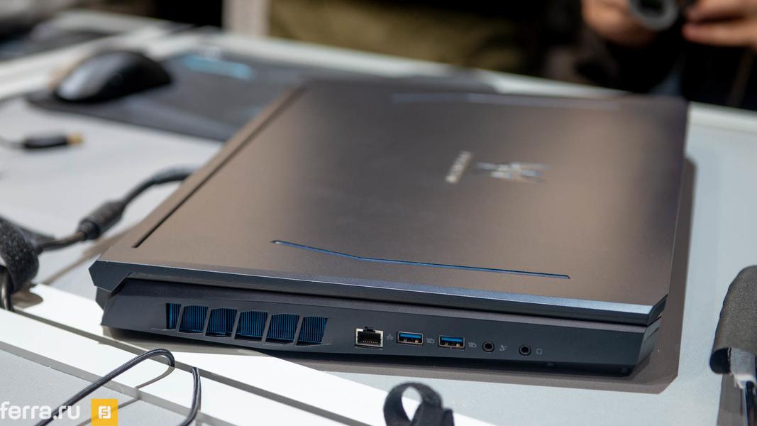 Самое вкусное — ноутбук Acer Predator Helios 700 — я оставил напоследок. Им можно восхищаться, его можно ненавидеть, но равнодушным точно остаться нельзя. Во-первых, он огромен — весит 4,5 килограмма, а порты, даже такие большие, как RJ-45, просто-таки теряются на его гранях высотой 4,2 см.