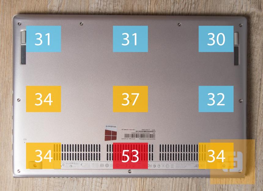 Играть в ресурсоёмкие игрушки, держа лэптоп на коленях, практически нереально: разогретый металл ощущается крайне некомфортно. Компактный металлический корпус не позволяет обеспечить эффективный отвод тепла от ЦПУ и дискретной видекарты. В сравнении с тем же Asus Zenbook UX32LN наш герой явно проигрывает. При идентичной температуре компонентов разница нагрева корпуса у этих двух ультрабуков достигает 13°C.