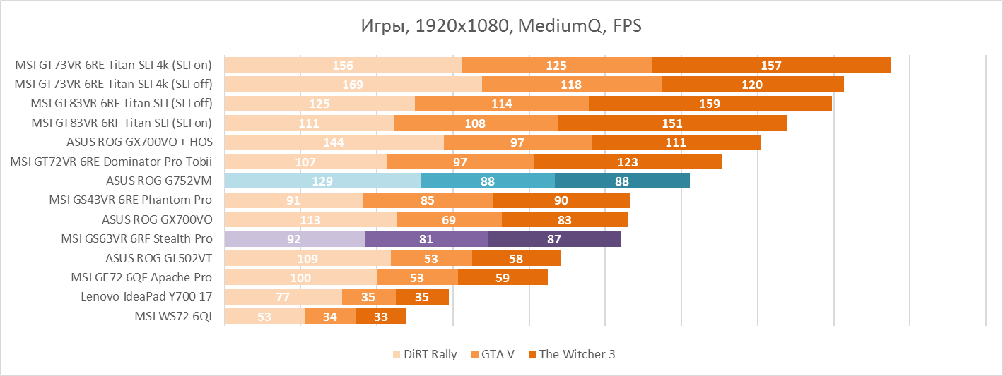 «Железо» в ASUS ROG G752VM очень хорошо сбалансировано. Самое первое, на что все обращают внимание, это, конечно, видеокарта. Здесь стоит NVIDIA GeForce GTX 1060 с 6 ГБ видеопамяти — оптимальная видеокарта для ноутбука в 2016 году. Правда, эксперимент с Mafia III показал, что при большом желании разработчиков игр любой технический прогресс может свести на нет даже игра с совершенно заурядным качеством графики. А вот в Battlefield 1 другой ноутбук, но с той же видеокартой и похожими характеристиками, показал под 80 кадров в секунду на максимальных настройках в сетевом режиме — не сказка ли? Да и в остальных играх подобная система ведёт себя как нельзя лучше — в GTA V, Ведьмаке и Dirt Rally количество кадров в секунду позволяет играть на высоких настройках с 60 FPS. Разве что на максимальных результат уже будет ниже. Но если раньше видеокарты «зелёных» уровня *60M вообще были совсем-такой middle-end, то нынешняя GTX 1060 позволяет уже практически ни в чём себе не отказывать. Также у ноутбука есть и встроенное видеоядро, но из-за наличия G-SYNC оно напрочь отключено, что плохо сказывается на времени автономной работы.