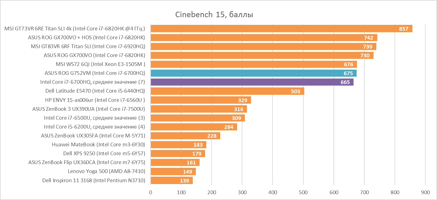С появлением заметно более производительных видеокарт огромную роль стал играть процессор, который аккомпанирует графическому ускорителю в играх. Для 1060-й какой-нибудь i5 уже слишком рискованный выбор, и, хотя такие ноутбуки можно найти на рынке, полагаю, что их лучше обходить стороной. В ASUS ROG G752VM же стоит Intel Core i7-6700HQ, в который не упрётся FPS в играх. Да и в других ресурсоёмких задачах он очень силён — у Intel на данный момент всего парочка мобильных CPU мощнее, чем этот.