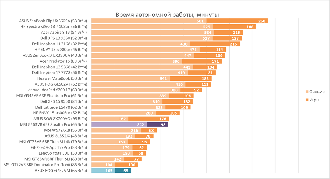 Время автономной работы — не самая сильная сторона всех без исключения игровых ноутбуков, но ASUS ROG G752VM умудрился обойти многих. И во многом это связано с тем, что из-за G-SYNC у него отключено встроенное видеоядро, которое помогало бы сократить расход аккумулятора, когда от ноутбука не требуется серьёзная графическая мощь. Но любой производитель в защиту своего геймерского лаптопа вам скажет, что он и не рассчитан долго работать от аккумулятора, для этого у него найдётся отдельный класс устройств, на который вам стоит обратить внимание, и, в целом, будем прав.