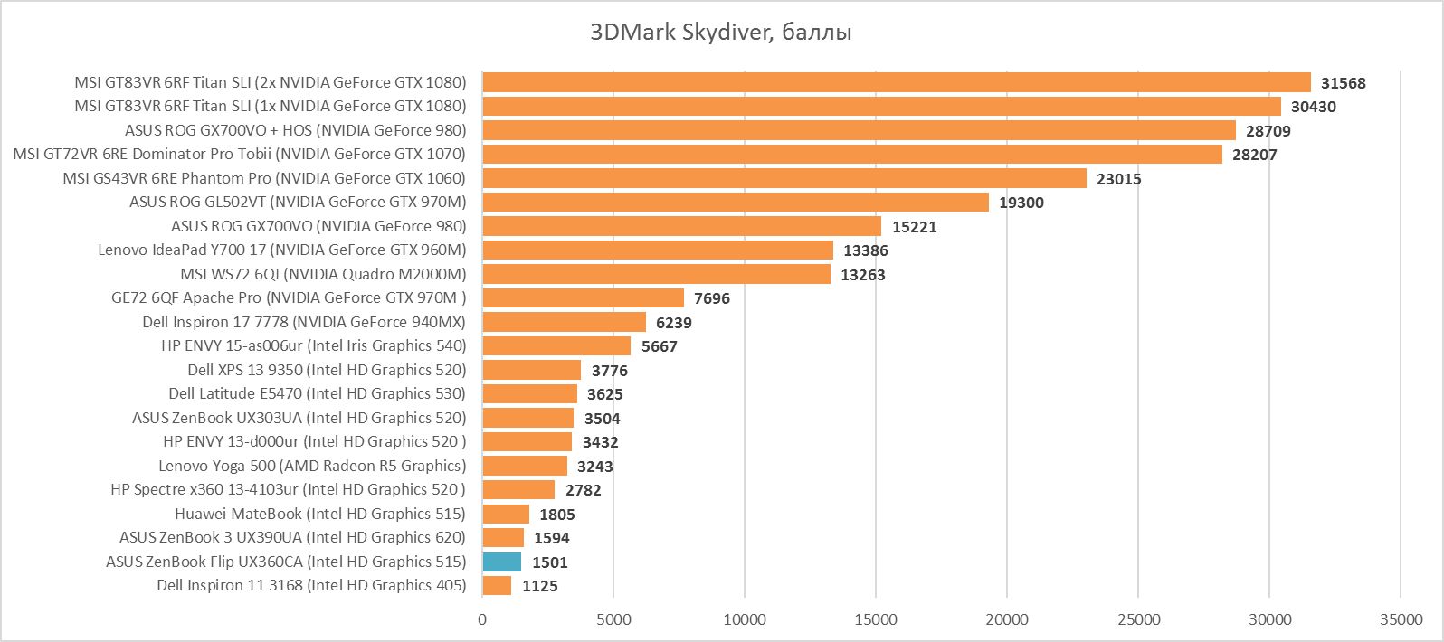 Производительность в графике у Intel HD Graphics 515 весьма низкая. А учитывая, что процессору, в который она встроена, явно не хватает охлаждения, результаты в бенчмарках и играх совсем удручающие. Конечно, ASUS ZenBook Flip — не игровой ноутбук, но даже в World of Tanks вы на нём не поиграете в разрешении всего лишь 1366х768 пикселей.
