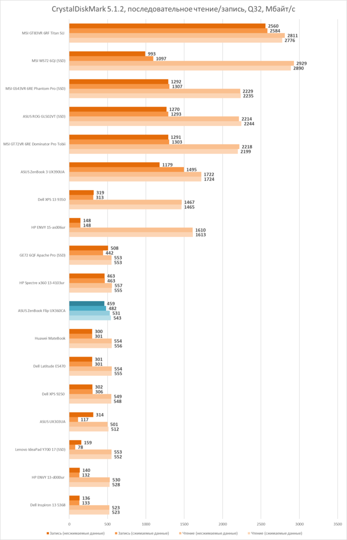 Семпл, который был предоставлен нам на тест, имеет SSD на 512 ГБ, но в магазинах пока можно найти ZenBook Flip только с «твердотельником» на 256 ГБ. Тот накопитель, что был у нас, оказался вполне неплохим середнячком — компромиссом между медленными HDD и самыми быстрыми SSD с интерфейсом PCIe. Участник теста поддерживает только SATA 3.0 и показывает соответствующие результаты. При этом, конечно, скорость отклика программ всё равно настолько высока, что вряд ли почувствуете себя обделённым.