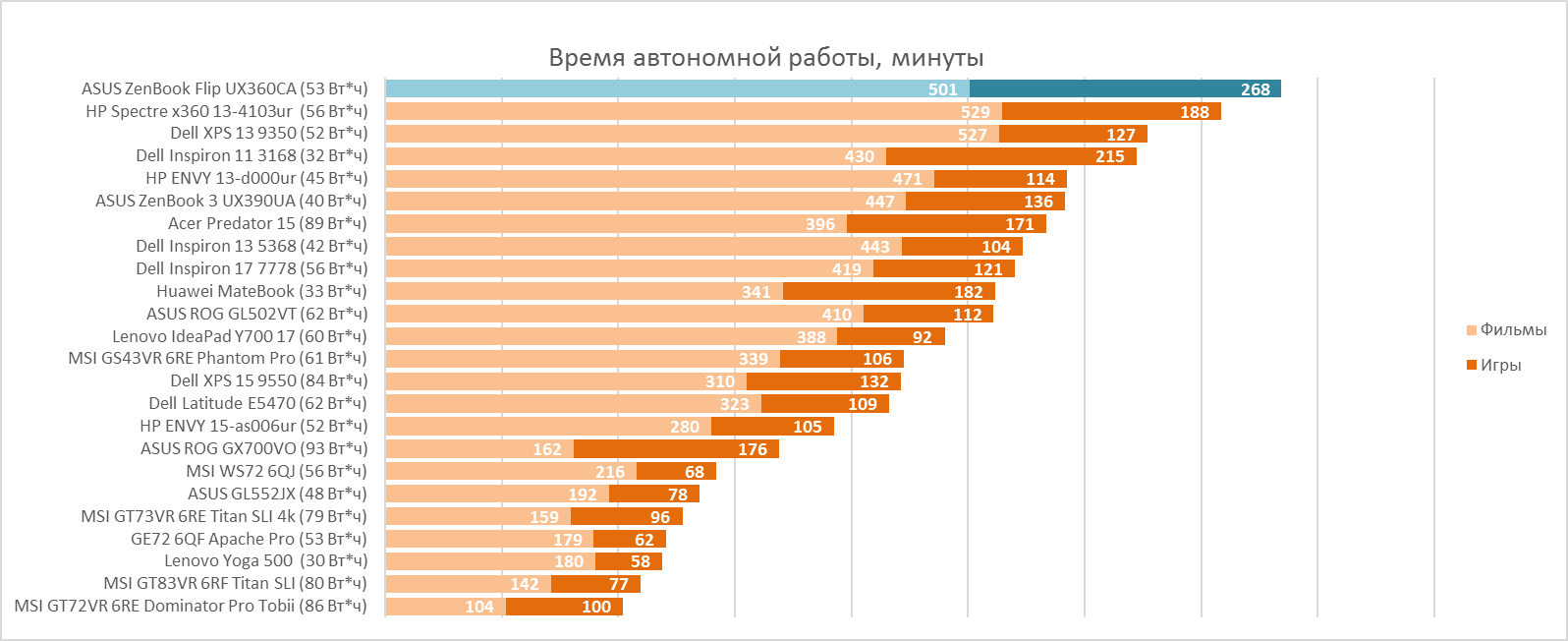 ASUS ZenBook Flip UX360CA отлично себя показал в тесте на продолжительность автономной работы. Но основная заслуга в этом, конечно, у 4,5-ваттного процессора Intel Core m7-6Y75. Благодаря нему лаптоп смог почти восемь с половиной часов показывать фильмы в разрешении 720p, с включённым Wi-Fi и интенсивностью подсветки на уровне 43% (160 кд/м2). Правда, на такое способны и парочка ультрабуков на гораздо более мощных процессоро — HP Spectre x360 13-4103ur и Dell XPS 13 9350.