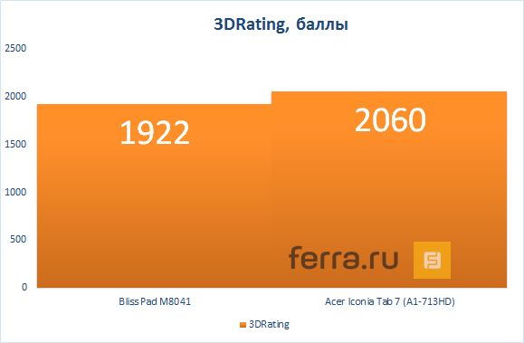 Последний планшет с наиболее близкой стоимостью, посетивший нашу редакцию, был Acer Iconia Tab 7 (A1-713HD). С ним мы и сравним результаты менее именитого Bliss Pad M8041.