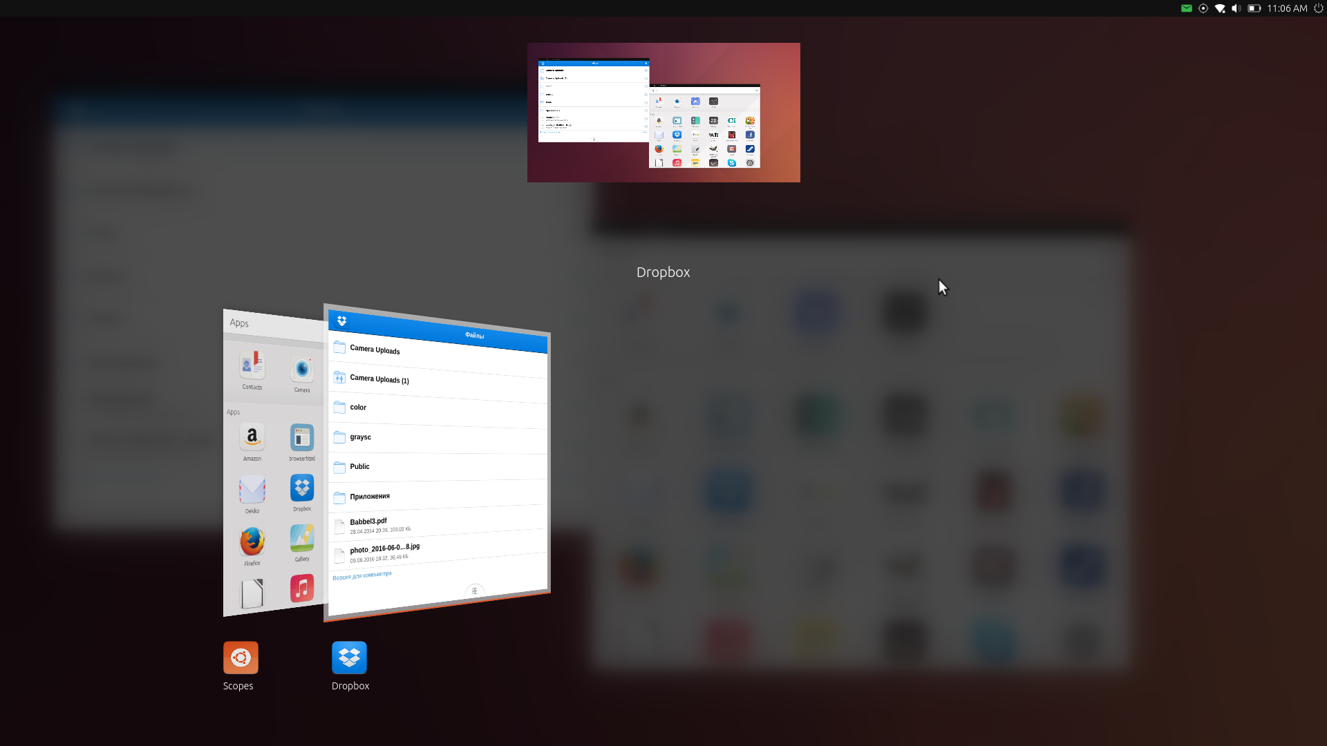 Третий экран — установленные приложения. А те, что еще не установлены, можно найти в Ubuntu Store, значок которого расположен на этом же экране внизу. Сказать, что их пока совсем уж мало, нельзя. Но всё-таки выбор сильно ограничен. Причём имеющиеся приложения зачастую выпущены сторонними разработчиками (видно, что в их существование на Ubuntu Touch больше заинтересовано Linux-сообщество, чем сами создатели этих привычных нам сервисов и приложений). Некоторые из программ плохо оптимизированы. Например, графический редактор GIMP и браузер Firefox не имеют никакой адаптации к управлению с помощью сенсорного экрана, а клиент Dropbox обладает весьма узким набором функций. Более того, в части приложений не всплывает клавиатура. Например, в Firefox. И, наконец, наименьшая на этом фоне проблеме — значки приложений нельзя менять местами, все они расставляются по окну «Приложения» автоматически.