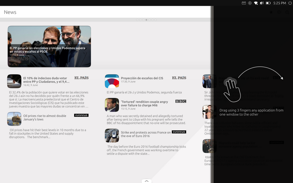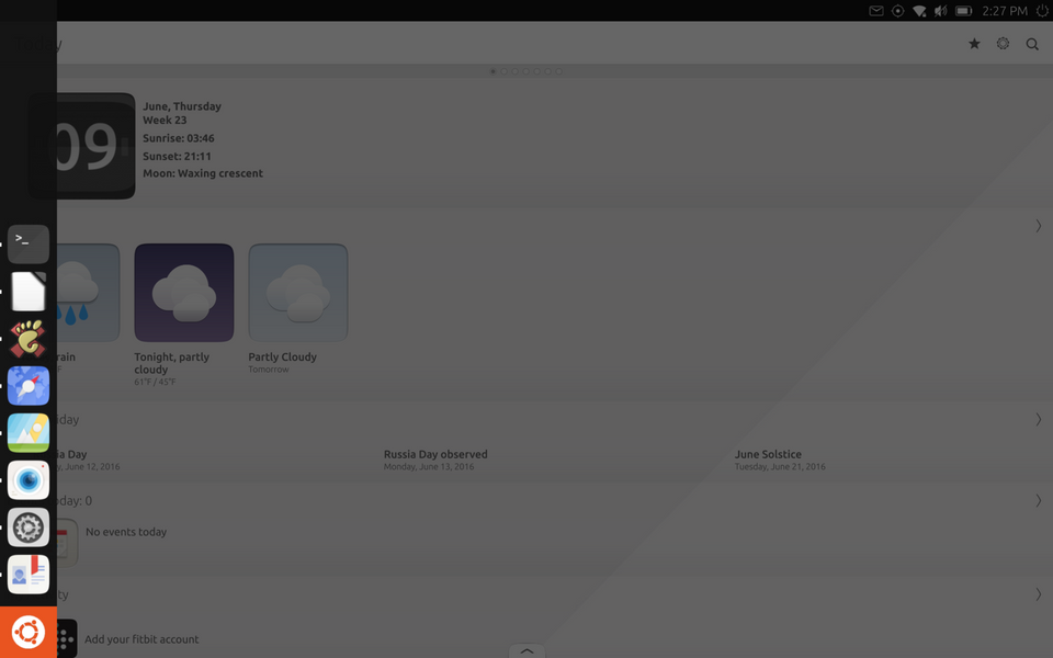 Главный экран Ubuntu Touch отнюдь не представляет собой рабочий стол с аккуратно расставленными значками и виджетами. Это приложение с семью окнами, где, по мнению разработчиков, собрано всё самое важное и первостепенное. Первый экран, который называется «Сегодня», содержит информацию о времени, дате, погоде, событиях из календаря, показывает информацию из Fitbit и Twitter, а также зарубежных СМИ. Отключить можно любое из этого, а поменять источник на другой почему-то возможности нет.