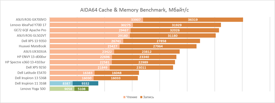 ОЗУ в Dell Inspiron 11 3168 всего 4 ГБ и это максимальный объём для модели. Для казуальных задач будет достаточно, да и редактор изображений вполне спокойно будет работать, если не пытаться скормить ему одновременно много файлов. Контроллер памяти, встроенный в данную систему-на-кристалле, не даёт Intel повода для гордости. Более того, по скорости чтения/записи лэптоп едва не проигрывает «противнику» на базе APU AMD (Lenovo Yoga 500 c AMD A8-7410), которая никогда не придавала этому аспекту большого внимания. А вот по общей производительности Dell Inspiron 11 3168 на Intel Pentium N3710 всё же проигрывает этому трансформеру, но за счёт меньшей производительности видеоядра.