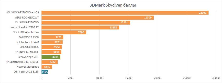 Если верить бенчмарку 3DMark Skydiver, то «тихоня» AMD A8-7410 почти втрое быстрее, чем решение Intel. К сожалению, непосредственно в играх сравнить эти две SoC у нас не было возможности. Но некоторые данные всё-так есть. Например, если с помощью Lenovo Yoga 500 в World of Tanks, запасшись терпением, можно играть в разрешении 1600х900 точек на средних настройках при 23 кадрах в секунду, то с теми же настройками, но уже в 1366х768 точек Dell Inspiron 11 3168 способен только на 16 кадров в секунду. А про Dirt Rally и говорить не хочется — 5 FPS делают из гонки трудноуправляемую пошаговую стратегию.