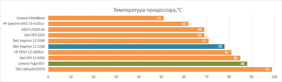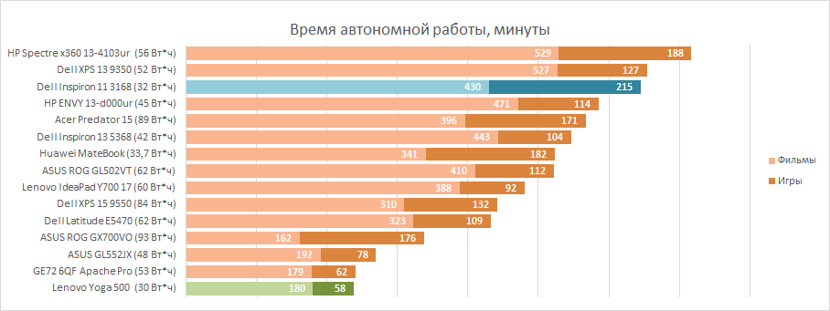 Аккумулятор у Dell Inspiron 11 3168 не слишком большой в связи с общей компактностью лэптопа, но это компенсируется весьма экономичным процессором. Прибавить к этому бюджетную TN-ку, которая потребляет меньше энергии, чем её Full HD-коллеги, и получается новый рекорд в нашей пока ещё молодой табличке энергопотребления ноутбуков на один Вт*ч аккумулятора. Причём сразу и в играх, и в фильмах. Смотреть последние на одном заряде батареи можно будет чуть больше семи часов. А если вам захочется поиграть, например, в старенькую Portal 2, то у вас в распоряжении будт 3,5 часа. Обратите внимание, что более производительных в играх Lenovo Yoga 500 заметно менее автономен несмотря на такой же аккумулятор.