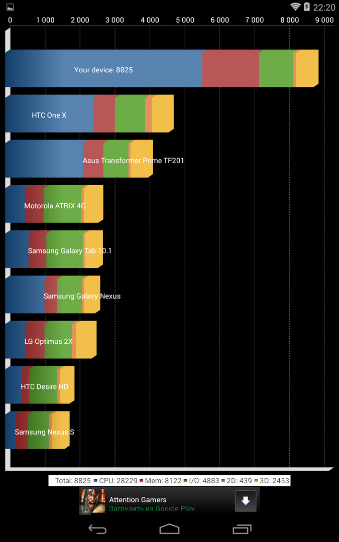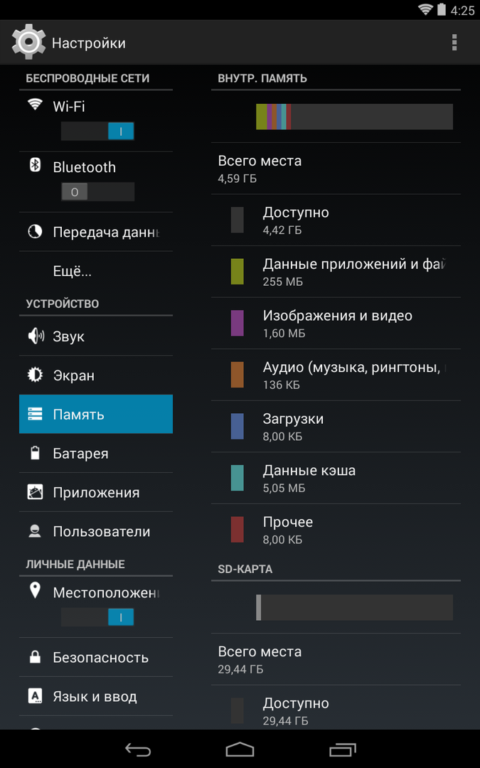 Из 8 гигабайт на внутреннем накопителе пользователю доступна лишь половина. Приятно, что все 4 гигабайта доступны в качестве системной памяти для .apk, но в ту же директорию помещаются и кэш-файлы, то есть абсолютно все программы и игры будут сохранять свои данные строго во внутренний накопитель, игнорируя карту памяти. Изменить эту ситуацию невозможно.
