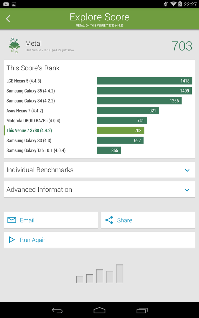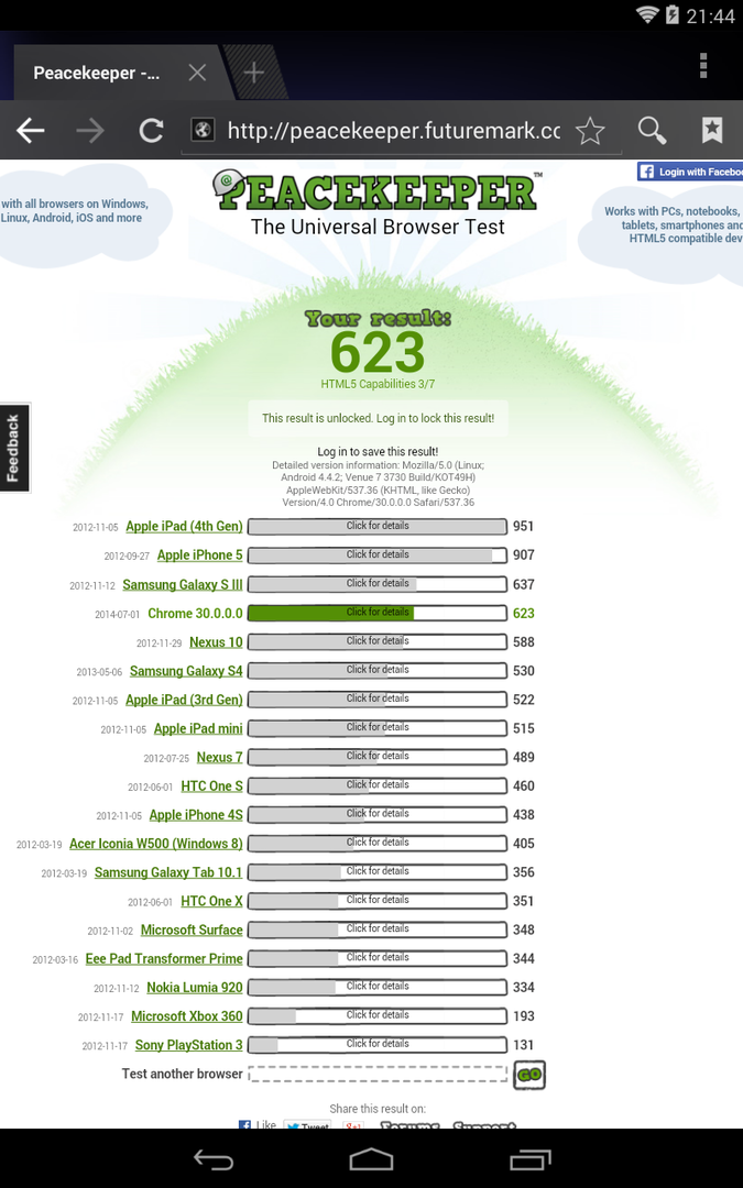 Экзотическая архитектура процессора практически никак не повлияла на реальную производительность Venue 7 — планшет работает стабильно, нагрев остаётся умеренным даже в самых экстремальных режимах, а несовместимость популярных приложений с чипами x86 осталась в прошлом. А вот интерфейс операционной системы работает плавно не всегда, особенно плохо работает Google Play. Вероятно, недавно вышедшая прошивка на базе Android 4.4.2 ещё не до конца оптимизирована. Планшет с тем же успехом мог бы быть основан на какой-нибудь «разогнанной» модификацией MediaTek MT8389 — ощущения при веб-сёрфинге и в играх был бы схожим, и это не так плохо.