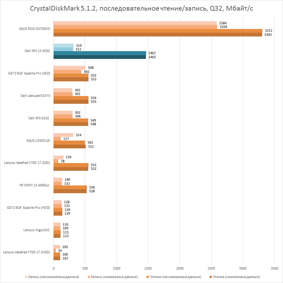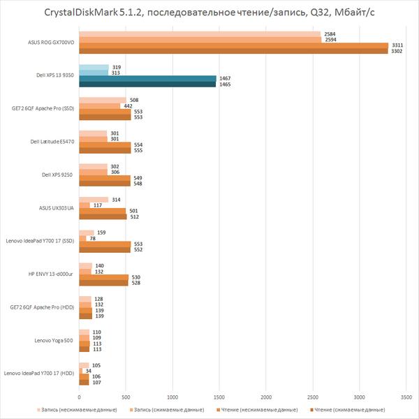 С процессором и графикой всё понятно — Dell XPS 13 9350 утирает нос побывавшим у нас тонким лэптопам, но увидеть разницу без измерения бенчмарками сложно. Но вот чем он действительно может похвастать, так это быстрым твердотельным накопителем. Здесь наш герой опережает даже некоторые игровые лэптопы. Что, правда, не так уж удивительно — Dell XPS 13 стоит дороже некоторых из них. И всё же скорость работы его SSD производства Samsung весьма высока, так что ваши программы не будут надолго «задумываться», ожидая, пока все файлы подгрузятся в оперативную память.